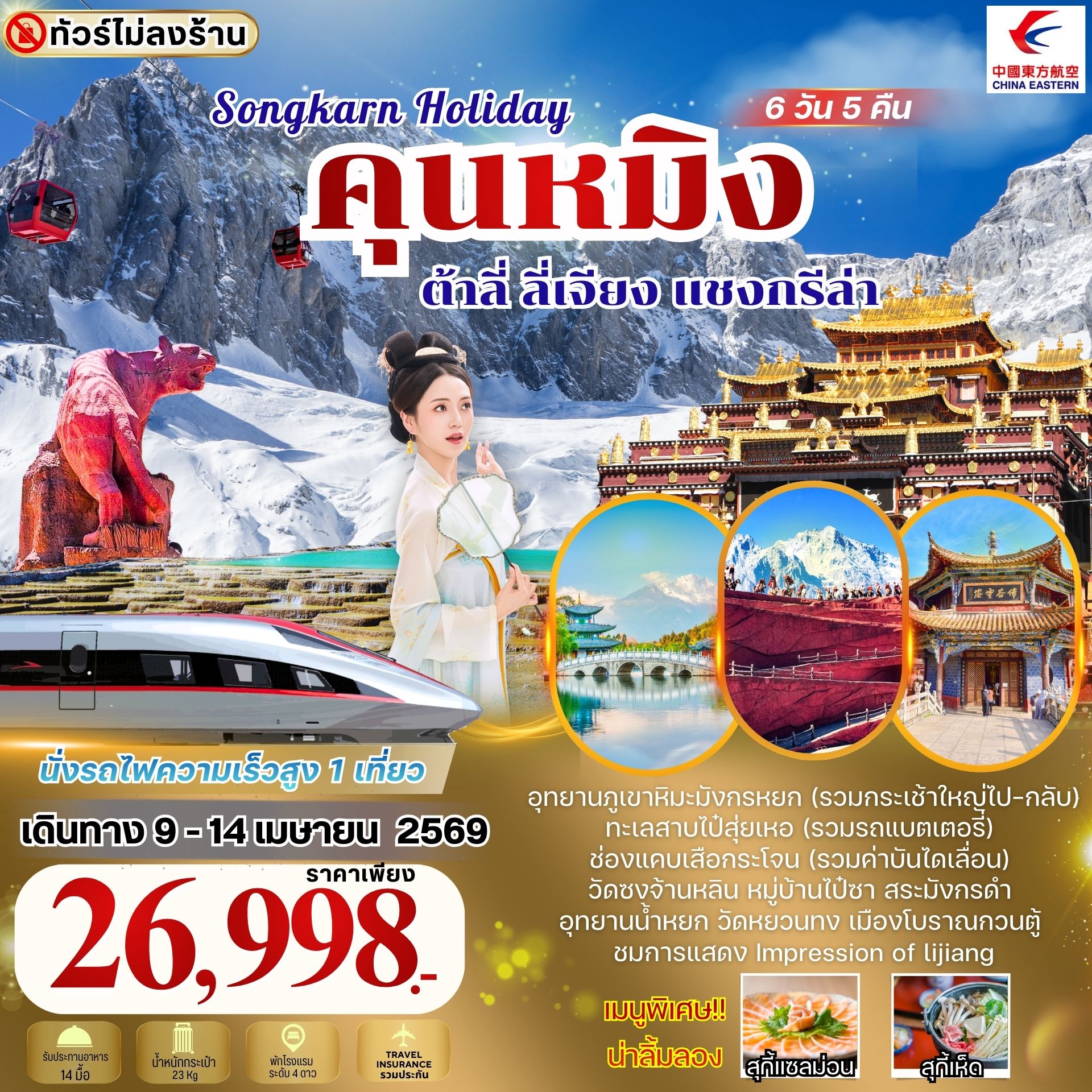 คุนหมิง ต้าลี่ ลี่เจียง แชงกรีล่า ภูเขาหิมะมังกรหยก 6 วัน 5 คืน นั่งรถไฟความเร็วสูง 1 เที่ยว
